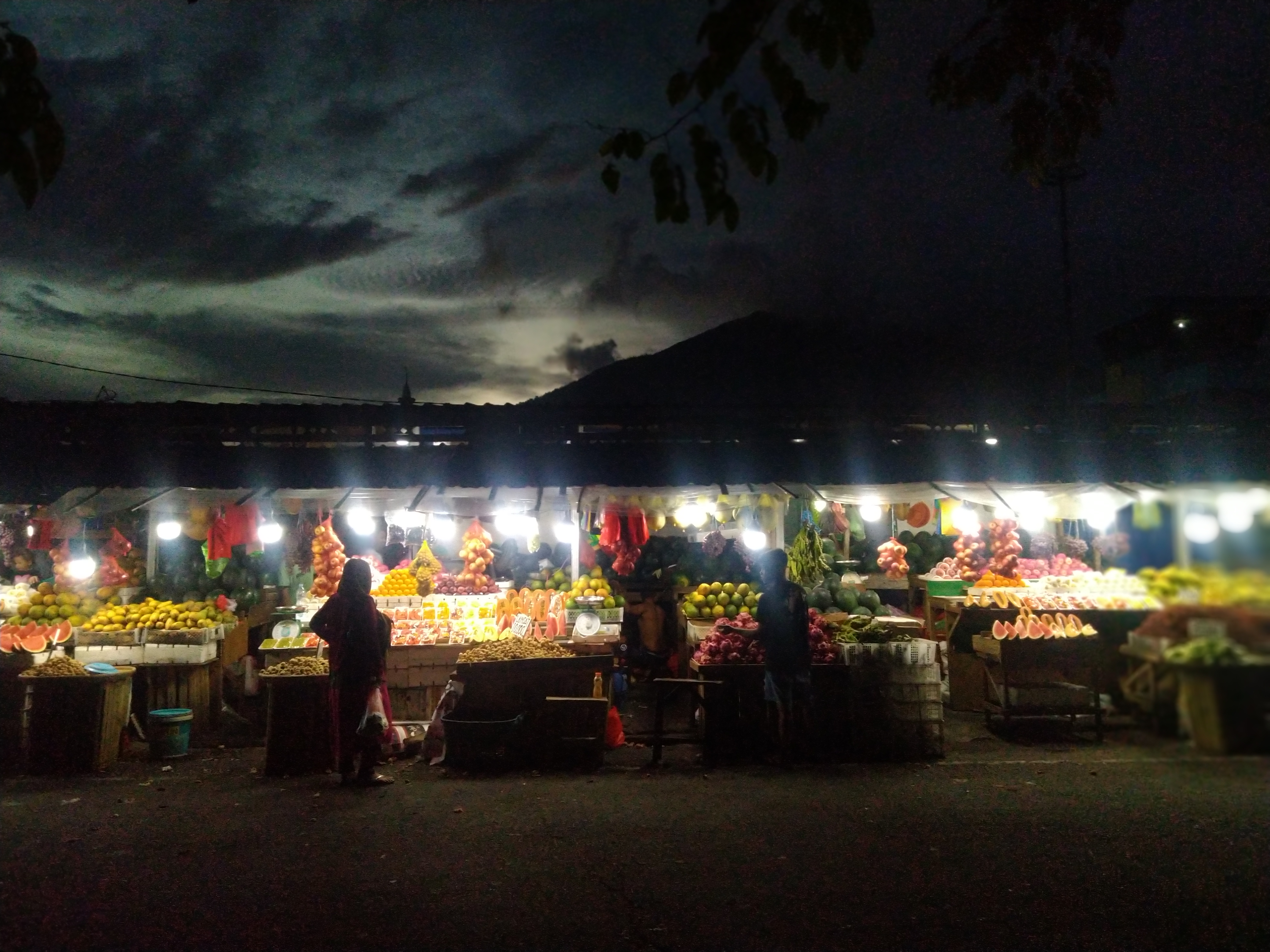 Malamnya, rombongan kami mampir di sebuah pasar tradisional. Cari durian, katanya. Sebagai non-penggemar durian, saya hanya memandang berkeliling, takjub dengan suasana pasar itu yang sungguh benderang. Rasanya, jarang melihat pasar tradisional yang aktif sampai malam begini.